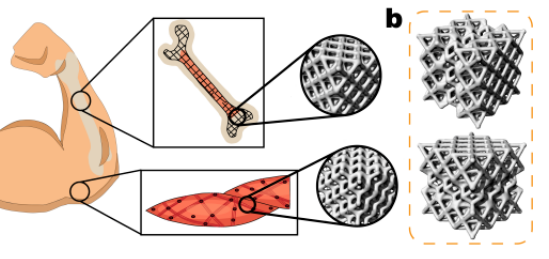 中國科學(xué)院福建物質(zhì)結(jié)構(gòu)研究所面向輕量化3D打印結(jié)構(gòu)在鞋業(yè)和汽車等領(lǐng)域的應(yīng)用開展研究。受自然界生物結(jié)構(gòu)兼具剛度和柔韌性的特征啟發(fā),科研人員通過分級彎曲和拉伸主導(dǎo)的結(jié)構(gòu)來設(shè)計(jì)混合架構(gòu)的晶格。進(jìn)一步,該工作使用純樹脂及高二氧化硅固含的復(fù)合材料,采用3D打印方式制備了以上晶格結(jié)構(gòu),并將結(jié)果與理論分析數(shù)據(jù)進(jìn)行比較以驗(yàn)證設(shè)計(jì)合理性。